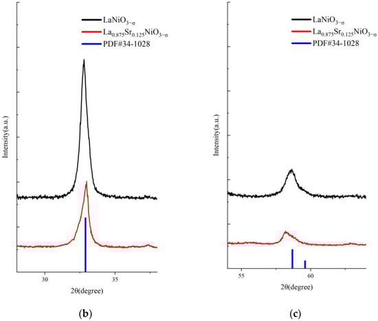 Sr-doping could cause changes in the lattice parameters due to different iron radii. As shown in Figure 3b, it is observed that the diffraction peak of Sr-doped LaNiO3−σ at about 32.77° shifted to a higher angle than that of undoped LaNiO3−σ, indicating that Sr-doping led to a decrease in the lattice parameters of LaNiO3−σ.