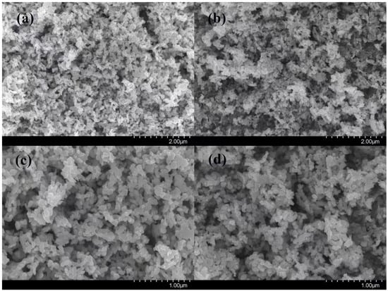 The Scanning electron microscopy (SEM) results of undoped and Sr-doped LaNiO3−σ are shown in Figure 4a,b, respectively, magnified by 50 k times. In addition, Figure 4c,d are the SEM images of undoped and Sr-doped LaNiO3−σ magnified by 100 k times, respectively. It can be observed that the undoped and Sr-doped LaNiO3−σ powder crystallized well under the predetermined experimental conditions, and the powder particles have formed agglomerates partially. The particle size distribution is in the range of 80–150 nm. Due to the small particle size and Van Der Waals force, the powder particles would interact with each other to form agglomerates.