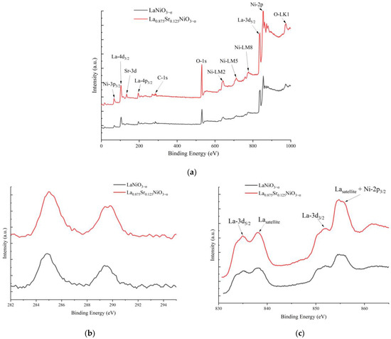 The surface chemical states were studied by X-ray photoelectron spectroscopy (XPS), which is used to characterize the elemental composition through qualitative analysis and elemental valence analysis on the powder sample surface. As shown in Figure 5a, the XPS spectrum was scanned extensively in the range of 0–1000 eV. The full scan spectrum of Sr-doped LaNiO3−σ has a more Sr-3d signal peak than that of undoped LaNiO3−σ, in which all peaks belong to elements labeled as La, Sr, Ni, O, and C, and there are no additional peaks corresponding to impurities. The peaks in 600–800 eV attribute to the Auger effect peaks of Ni, including Ni-LM2, Ni-LM5, and Ni-LM8. The peak of 974 eV belongs to the Auger effect peak of O, which is attributed to O-LK1. As shown in Figure 5b, the emerged C-1s peaks at 284.8 eV and 289.5 eV are attributed to the carbon supporting film on the grid [], which is used to calibrate other binding energy in the spectrum.
