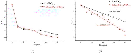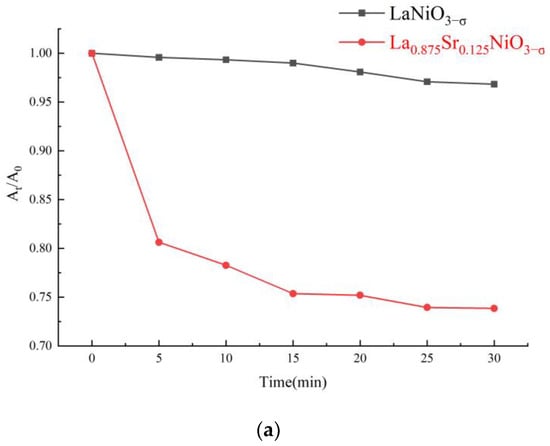 In Figure 6d, it can be observed that, compared with undoped LaNiO3−σ, the lattice oxygen content of Sr-doped is reduced, and the chemisorbed oxygen content on the sample surface is increased. Therefore, Sr-doping can introduce more oxygen vacancy into perovskite and significantly improve the adsorption of oxygen molecules on the surface of Sr-doped LaNiO3−σ, enhancing the photocatalytic performance of LaNiO3−σ.