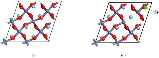 According to the XRD results of the prepared LaNiO3, the crystal phase of LaNiO3 is R-3c rhombohedral space group, as shown in Figure 8a, and the unit cell contains 10 calculated atoms, so all the first-principle calculations are based on this structure. A model of LaNiO3 was built, which is a 2 × 2 × 1 supercell of the R-3c space group, as shown in Figure 8b, while the periodical extra Ni atoms were removed. Meanwhile, Figure 8c is the top view of the LaNiO3 2 × 2 × 1 supercell containing 40 atoms. Based on the LaNiO3 2 × 2 × 1 supercell, the La atom on the 1-position was substituted by the Sr atom, and the O atom on the 2-position was removed, so La0.875Sr0.125NiO3−σ 2 × 2 supercell s built as shown in Figure 8d, while LaNiO3−σ and La0.875Sr0.125NiO3 are also built but not shown.