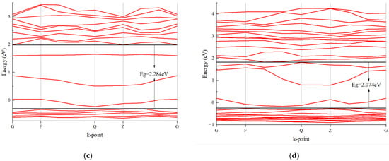 As shown in Figure 9, according to First-principle, the calculation results of the four kinds of supercells show that the band gap width is 2.975 eV, 2.599 eV, 2.284 eV, and 2.074 eV for LaNiO3, LaNiO3−σ, La0.875Sr0.125NiO3, and La0.875Sr0.125NiO3−σ, respectively. It can be observed that compared with LaNiO3, the conduction band level of LaNiO3−σ decreases, which leads to a narrower band gap width. The same situation occurs in La0.875Sr0.125NiO3, whose band gap width is even smaller than that of LaNiO3−σ. Moreover, La0.875Sr0.125NiO3−σ obtained the smallest band gap width among the four supercell crystals under the combined action of oxygen vacancy and Sr element. The introduction of oxygen vacancy and Sr-doping will lead to the narrowing of the band gap width of LaNiO3 so as to obtain a wider light response range. The simulated band gap width of complete LaNiO3 is 2.975 eV, which is quite close to the experimental result of 3.010 eV by Aamir Ghafoor et al. [].