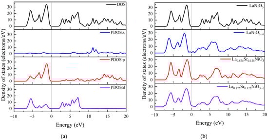 The calculation of the density of states is helpful in analyzing the composition of conduction and valence bands in the band structure of the supercells. Figure 10a shows the density of states (DOS) and partial density of state (PDOS) of the complete LaNiO3 supercell in the range of −10~20 eV. It can be observed that the conduction band of LaNiO3 is mainly composed of d orbitals in the range of −8~0 eV, and the valence band is composed of p orbits and d orbits in the range of 0~10 eV, while there is too high energy level in s orbits.