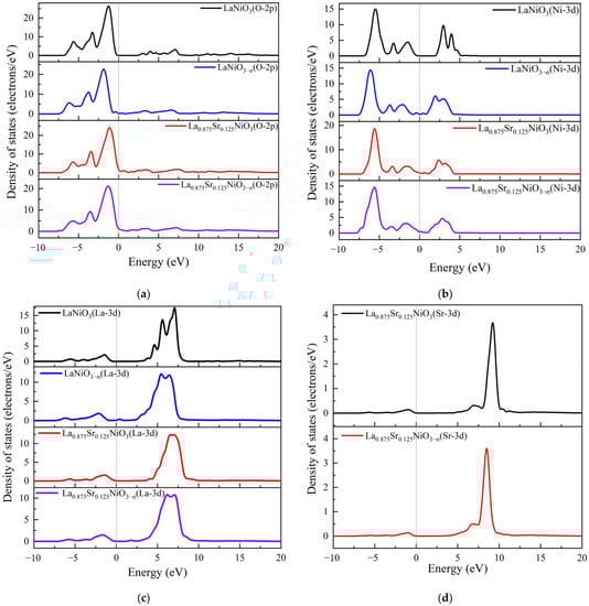 The results of the partial density of states are shown in Figure 11. It is observed that the valance band in the range of −8~0 eV is mainly composed of O-2p and Ni-3d orbits, while the conduction band in the range of 0~10 eV is mainly composed of Ni-3d and La-3d orbits. Moreover, the introduction of oxygen vacancy causes the O-2p and Ni-3d orbitals to generate new energy levels near the Fermi level and all PDOS to shift globally toward lower energy levels. As shown in Figure 11d, the Sr-3d orbit didn’t generate new energy levels near the Fermi levels. However, Sr-doping promotes O-2p and Ni-3d to generate new energy levels near the Fermi level, which is also the reason why the band gap width of La0.875Sr0.125NiO3 supercell becomes narrower.