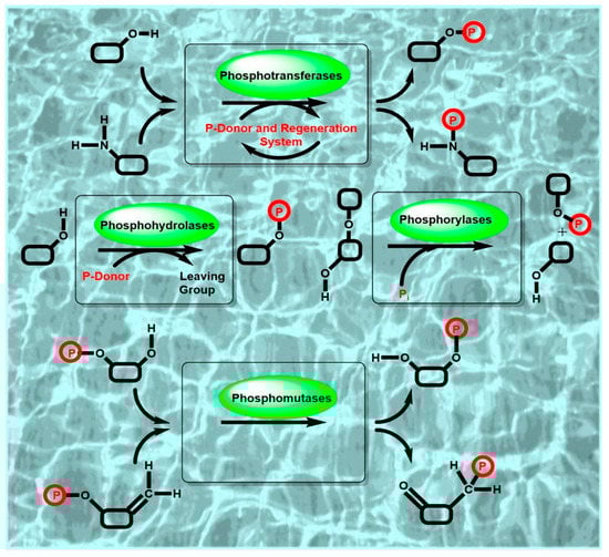 Schematic representation of key classes of phosphorylation biocatalysts and the involved reactions.