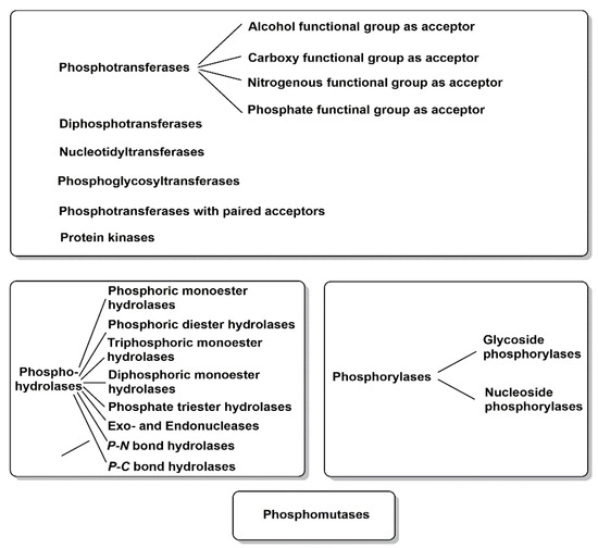 Biocatalysts which catalyze phosphoryl group transfer reactions are mainly classified in the class of transferases, which have an Enzyme Commission (EC) four-digit number starting with two, but there are also various phosphorylation biocatalysts from the hydrolases of EC class 3 and the isomerases from EC class 5. Therefore, phosphotransferases and phosphorylases of EC class 1, phosphohydrolases of EC class 3 and phosphomutases of EC class 5 form the scope of this review. Beyond the scope of this review are biocatalysts which, in addition to phosphorylation, catalyze other reactions, such as D-glyceraldehyde 3-phosphate dehydrogenase from the oxidoreductases of EC class 1 catalyzing the oxidative phosphorylation of D-glyceraldehyde 3-phosphate to D-1,3-diphosphosphate glycerate, or carbamoyl phosphate synthases, which utilize ammonia or hydrolyze L-glutamine, from the ligases of EC class 6 catalyzing carbon–nitrogen bond formation in addition to phosphorylation.