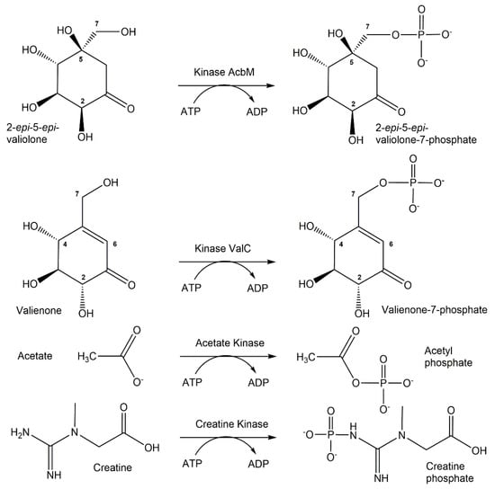 The large functional diversity of phosphotransferases, illustrated also by the many different phosphorylation reactions and acceptor substrates ranging from metabolites and other small molecular weight compounds to large biomolecules such as proteins, enables the highly selective biocatalytic transfer of a defined number and the molecular nature of a phosphoryl-group-containing donor to one specific functional group of an acceptor molecule [,]. Thereby, the highly selective formation of new covalent bonds of phosphorus to oxygen, nitrogen, sulfur and carbon is very attractive, as a large number of phosphotransferases exist in nature and no protecting groups for donors and acceptors are needed. The exquisite selectivity of phosphotransferases in catalyzing the phosphorylation of a particular hydroxy group is illustrated in Figure 3 by the two ATP-dependent kinases AcbM and ValC. The kinase AcbM plays an important role in the biosynthetic pathway to the seven-carbon cyclitol unit of the antidiabetic drug acarbose in the Actinoplanes sp. and catalyzes the formation of 2-epi-5-epi-valiolone-7-phosphate []. For the phosphorylation of the closely related substrates valienone and validone to valienone-7-phosphate and validone-7-phosphate, respectively, the different kinase ValC is required, which has a critical function in the biosynthesis of the antifungal compound validamycin A []. Short chain fatty acid kinases are involved in central metabolic pathways catalyzing the reversible ATP-dependent phosphorylation of carboxylic acids leading to the formation of acyl-phosphates, such as acetate kinase (see Figure 3) catalyzing the phosphorylation of acetate to acetyl-phosphate [,]. Phosphagen kinases, such as creatine kinases (see Figure 3) catalyzing the ATP-dependent reversible N-phosphorylation of creatine, are key enzymes in catalyzing the formation of high energy phosphorus nitrogen bonds [,].