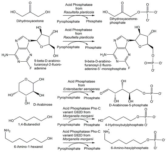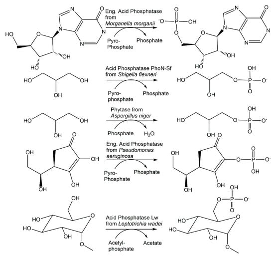 The ability of a number of phosphatases to catalyze not only hydrolysis reactions but also phosphorylation reactions has been investigated for more than seven decades []. Although hydrolytic activities can counteract phosphorylation reactions by reducing the yield of phosphorylated products, the differential hydrolysis of enantiomers to chiral precursors of antiviral compounds by phosphotriesterase variants [], increasing the transferase/hydrolase ratio of phosphatases by protein engineering and the combined use of suitable phosphatase, inexpensive phosphoryl donors and reaction engineering offer new opportunities for broadly applicable and scalable phosphorylation reactions. Acid phosphatase from Morganella morganii has been found to also catalyze the 5′-phosphorylation of nucleosides (see Figure 4) using not only the energy-rich carbamoyl phosphate and acetylphosphate, but also pyrophosphate as an inexpensive phosphoryl donor []. While the closely related acid phosphatase from Providencia stuartii exhibited phosphorylation activity similar to the M. morganii enzyme, the acid phosphatases from Enterobacter aerogenes, Escherichia blattae and Klebsiella planticola showed lower phosphorylation activities []. Nonspecific acid phosphatases from Shigella flexneri and Salmonella enterica, which have been shown to be selective for phosphorylate D-glucose to D-glucose-6-phosphate, without the formation of D-glucose-1-phosphate, using pyrophosphate [], have also been demonstrated (see Figure 4), together with other acid phosphatases such as PiACP from Prevotella intermedia, to catalyze the selective phosphorylation of monoalcohols and diols [].