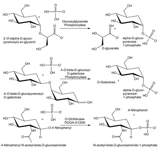 A high-throughput assay has been used to screen a metagenomic source library for glycoside phosphorylases, whereby seven new glycoside phosphorylases from the CAZy family GH94, among them two cellobiose phosphorylases, two cellodextrin phosphorylases and two laminaribiose phosphorylases, and a β-1,3-oligoglucan phosphorylase from the CAZy family GH149 []. Expressing and characterizing what was thought to be a sucrose phosphorylase from Meiothermus silvanus, residing in an unexplored branch of glycoside hydrolase family GH13, enabled the discovery of a glucosylglycerate phosphorylase (see Figure 9) []. By identifying and experimentally screening unknown clusters of the glycoside hydrolase family GH94 sequence space, using a combination of phylogenetic analysis and SSN, it was possible to discover a new 4-O-β-D-glucosyl-D-galactose phosphorylase (see Figure 9) from Paenibacillus polymyxa []. Efficient glucosaminide phosphorylases (see Figure 9), which have been engineered from GH84 O-GlcNacases by a single point mutation, have been shown to be 10-fold more active than their naturally occurring counterparts []. Widening the substrate spectrum is also of much interest for nucleoside phosphorylases, which has been achieved by engineering novel variants of purine nucleoside phosphorylases [] and by the wider substrate spectrum of thermophilic nucleoside phosphorylases [].