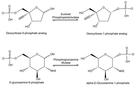 The discovery of novel enzymes catalyzing intramolecular phosphoryl-group transfer has been especially interesting in the area of the phosphopentomutases, for example, engineered phosphopentomutase variant enzymes (see Figure 10) catalyzing the isomerization of a deoxyribose-5-phosphate analog to the corresponding deoxyribose-1-phosphate analog []. The recombinant expression of the ST0242 protein from Sulfolobus tokadaii has led to the discovery of its phosphoglucosamine-mutase and phosphogalactosamine-mutase activity [].
