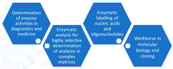 The manufacturing of suitable and highly active phosphorylation biocatalysts which have been made available as fit-for-purpose enzymes and with negligible levels of undesired contaminating enzyme activities continue to be important prerequisites for analytical applications (see Figure 11), as already shown with the development of methods for enzymatic analysis several decades ago [,], for example, in the applications of glycerol kinase for the determination of glycerol or creatine kinase for the analysis of creatine. Significant improvements in the individual steps of the overall approach to enzymatic analysis, by efficient enzyme production using recombinant technologies, analytical method optimization, international standardization, miniaturization and automation have facilitated analytical applications and have led to its routine use in diagnostics. Building on the principles of enzymatic analysis established long ago and the power of phosphorylation biocatalysts, the highly selective determination of analytes in complex matrices can be achieved without time-consuming prior sample preparation.