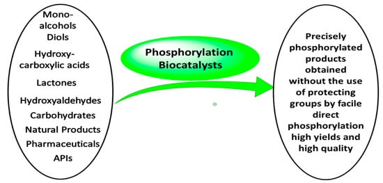The great methodological advances for the discovery and development of novel biocatalysts which have been provided by directed evolution, protein engineering and computational approaches to protein design have enabled the optimization of biocatalyst properties such as activities, selectivities or stabilities, and their adaptation to reaction conditions [,]. The power and potential of these tools and methodologies has attracted much interest as they provide the opportunity to develop numerous phosphorylation biocatalysts since the directed evolution of thymidine kinase for the phosphorylation of zidovudine [], and their use in tackling challenging new-to-nature phosphorus chemistry is very interesting [].