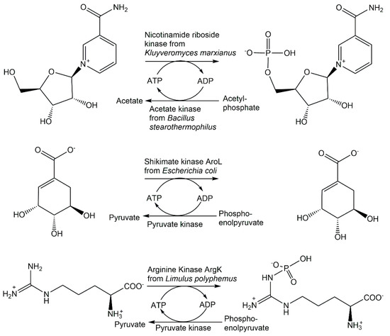 - Andexer, J.N.; Richter, M. Emerging Enzymes for ATP Regeneration in Biocatalytic Processes. ChemBioChem 2015, 16, 380–386. [Google Scholar] [CrossRef]