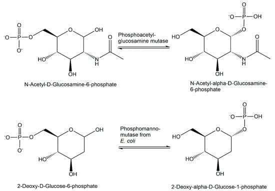 While D-glucose 6-phosphate interconversion catalyzed by α-D-phospho-glucomutases leads to α-D-glucose 1-phosphate [], β-D-glucose 1-phosphate is obtained when its interconversion is catalyzed by β-D-phosphoglucomutases [] in the thermodynamically unfavorable rearrangement of phosphoenolpyruvate to 3-phosphonopyruvate catalyzed by phosphoenolpyruvate mutase [].