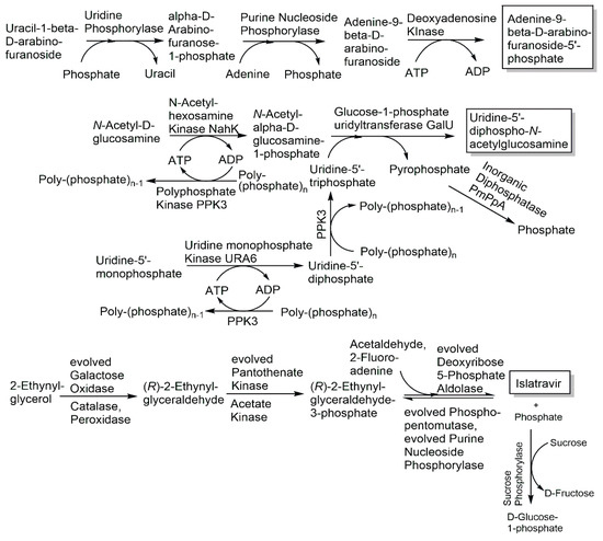 - Huffman, M.A.; Fryszkowska, A.; Alvizo, O.; Borra-Garske, M.; Campos, K.R.; Canada, K.A.; Devine, P.N.; Duan, D.; Forstater, J.H.; Grosser, S.T.; et al. Design of an in vitro biocatalytic cascade for the manufacture of islatravir. Science 2019, 366, 1255–1259. [Google Scholar] [CrossRef]