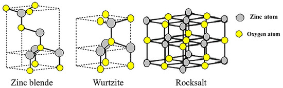 ZnO is among one of the most used semiconductors because of its ease of synthesis and its photo-driven electronic response. ZnO is a crystalline n-type semiconductor, it is a member of the II–VI group, and it exhibits a wide bandgap (3.37 eV) in the near UV spectrum [17,18]. Moreover, it exhibits high exciton binding energy (60 meV) in standard atmospheric conditions [19]. With respect to its crystallographic structures, ZnO has three polymorphs, namely: zincblende, cubic rock salt, and the hexagonal wurtzite. Of these polymorphs, wurtzite is the most stable, hence its synthesis at room temperature (RT) under pressure. The rock salt polymorph is formed under high pressure which results in the close packing of the Zn and O atoms, as shown in Figure 1. The zincblende polymorph ZnO is metastable, and therefore, it cannot exist on its own in ambient conditions [20,21]. With respect to the morphology of ZnO, as seen under transmission electron microscopy (TEM) and scanning electron microscopy (SEM), there is a wide variety of nanoparticulate ZnO morphologies. These include nanorods [22], spheres [23], nanosheets [24], hexagons [25], tripods [26], nanowires [27], nanotubes [28], nanostars [29], nanoflowers [30], and nanocubes [31], as shown in Figure 2.