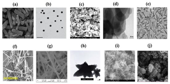ZnO morphologies: (a) nanorods (Reprinted with permission from Ref. [33], © 2020, American Institute of Chemical Engineers) (b) spherical (Reprinted with permission from Ref. [34], © 2020, The Society for Applied Microbiology) (c) nanosheets [24], (d) hexagonal [35], (e) tripods (Reprinted with permission from Ref. [36], © 2015, American Chemical Society) (f) nanowires (Reprinted from Ref. [27], © 2020, American Chemical Society) (g) nanotubes, (Reprinted with permission from Ref. [28], © IOP Publishing Ltd) (h) nanostars [29], (i) nanoflowers [37], and (j) nanocubes (Reprinted with permission from Ref. [31],© 2016, Elsevier Inc).