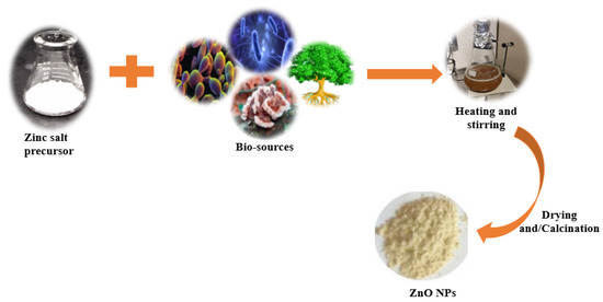 Over the last few decades, the “green synthesis” approach has received a lot of interest in the field of nanomaterial synthesis. Indeed, the green synthesis technique for nanomaterials is based on twelve green chemistry principles, namely: (i) to improve the reaction efficiency of atoms (atom economy); (ii) to improve the energy efficiency of reaction processes (i.e., avoidance of long synthesis times, high temperatures, and high pressure environments); (iii) to use harmless chemicals in order to reduce the toxicity of the procedures and the synthesized nanomaterials; (iv) to reduce waste throughout the synthesis process; (v) to use easily available renewable precursors; (vi) to design non-toxic biodegradable products; (vii) to follow safer synthesis routes and replace hazardous substances with safe (or at least less toxic) reagents; (viii) to avoid the use of derivatives such as stabilizers; (ix) to avoid the release of toxic waste; (x) to employ eco-friendly solvents, such as water, instead of organic solvents; (xi) to accelerate reactions by including a catalyst, so as to reduce total energy demands in order to improve sustainability and efficiency; and (xii) to limit accidents during and after the synthesis process [53,54,55]. In traditional chemical synthesis, organic capping agents such as oleic acid, linolenic acid, oleylamine, hexadecylamine, and 2-mercaptoethanol need to be used to attain particles with the desired morphology and with a high degree of uniformity [56]. Biological synthesis, on the other hand, encourages the use of readily available resources, such as non-toxic solvents and auxiliaries, for a benign synthesis protocol [57]; therefore, it is in accordance with the principles of green synthesis. Biological synthesis promotes the development of nanoparticles using nature-derived materials such as plants [58], bacteria [59], fungi [60], algae [61], and biological derivatives [62]. These bio-sources (enzymes, polysaccharides, phytochemicals, biomolecules, vitamins, etc.) serve as green capping, stabilizing, or chelating agents [7]. During biosynthesis, a zinc salt such as chloride, acetate, sulfate, or nitrate is generally added to a previously prepared biological extract (from plants, bacteria, fungi, algae, yeast, etc.) to facilitate the complexation of metal ions with the available functional groups in the biological extract (Figure 3). This is achieved by heating and stirring the extract in an alkaline environment. The temperature, pH, and ratio of the precursors determine the growth phase, wherein the nucleated seeds grow either isotropically or anisotropically. Moreover, as is the case in conventional chemical synthesis processes, the synthesis parameters in green synthesis procedures determine the morphology, size, agglomeration, and size distribution of the resultant NPs [63]. After the metal oxide precipitates, it is washed, dried, and/or calcined to produce ZnO NPs, as indicated in Figure 3.