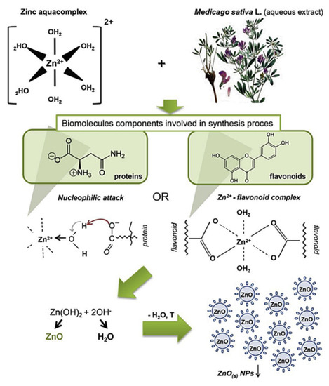 Various parts of a known plant species, including the leaves, seeds, pericarps, peels, roots, bark, or even the whole plant, have been used to synthesize ZnO NPs. Zinc salts are said to be oxidized by phenols and flavonoids into ZnO NPs with the help of the numerous functional groups that these molecules possess. These functional groups attach onto the surface of Zn2+, and they oxidize the molecule into ZnO NPs [63,75]. Since the coordination chemistry of proteins is specific to that of zinc ions, they are the predominant chelating agents for Zn2+. The H2O molecules of the aqua complexes are exchanged when they bind to the protein ligands [76]. During their interaction with the acidic [Zn(H2O)6]2+, an electron from the initiates a nucleophilic reaction, which results in the formation of the [Zn(OH) (H2O)5]+ complex [77]. The [Zn(OH) (H2O)5]+ is then transmuted into ZnO NPs [78]. According to Singh et al., the −OH and/or −COO− of the flavonoids react with the ZnO precursor to generate a distinctive Zn flavonoid complex via the electrostatic interaction between negatively charged flavonoids and positively ZnO nuclei. This complex is then later converted to ZnO through thermal treatment [79]. An alkaline pH favors the formation of metal oxide nanoparticles that are stabilized by the phytochemicals in the plant extract [80]; thus, it follows that during the phytosynthesis of metal oxides such as ZnO, a combination of polyphenols, flavonoids, and proteins results in the creation of ZnO NPs [81]. Krol et al. [77] presented a probable reaction mechanism for a plant mediated ZnO, as shown in Figure 4.