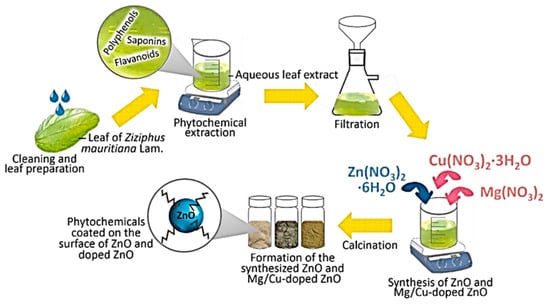 Schematic diagram of the synthesis of Mg/Cu dual-doped ZnO. (Reprinted with permission from Ref. [109], © 2021, Elsevier Ltd.).