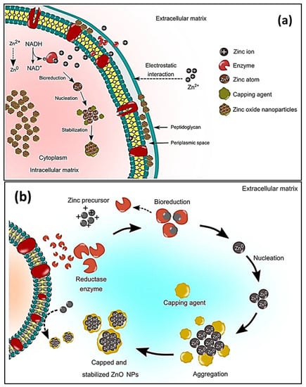 Schematic representation of the (a) microbial intracellular synthesis and (b) microbial extracellular synthesis of ZnO NPs [119].