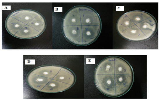 Antimicrobial activity of Aspergillus fumigatus synthesized ZnO NPs [132] working against (A) Klebsiella pneumonia, (B) P. aeruginosa, (C) E. coli, (D) S. aureus, and (E) B. subtilis at different concentrations.