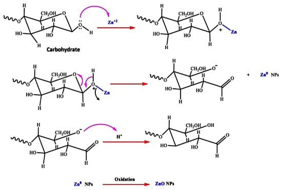Algae are mono and multicellular aquatic photosynthesizing organisms, but unlike plants, algae are without roots and leaves [115]; however, similarly to plants, macroalgae have active metabolites such as alkaloids, peptides, polysaccharides, proteins, tannins, quinones, lipids, and glycerol [146]. These metabolites have –OH and –COOH functional groups that can chelate and stabilize ZnO NPs [146]; therefore, the chemical formation route of ZnO NPs during algal synthesis is similar to that of plants [57], as discussed in Section 2.1.1. Khalafi et al. [140] propose a mechanism of ZnO NP formation using a Chlorella extract (Figure 8). Based on the assumption that chlorella contains a significant amount of carbohydrates (20%), it was presumed that carbohydrates predominantly served as Zn2+ reducing agents and as stabilizers of the prepared ZnO NPs. Moreover, the biosynthesis of green ZnO NPs was assumed to occur through a donor–acceptor mechanism that occurred between the oxygen atoms of functional moieties in chlorella and Zn2+ wherein the −OH groups on the carbohydrates transfers an electron to the electrotrophilic Zn species, thus resulting in the oxidation of the −OH group and Zn2+ reduction to Zn atoms.
