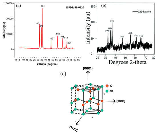 The X-ray diffraction peaks of the biosynthesized ZnO samples displayed broadening, which can be attributed to the nano-scaled size of the samples; this was accompanied by fewer internal stresses within the sample [58]. In most of the green synthesis processes that were reported, the procedure ends with the calcination of amorphous ZnO in order to transform it into crystalline ZnO; as such, the high degree of crystallinity that was observed is more likely to be due to the high temperature than the use of green biosynthetic protocols. This is expected since annealing repairs the structural defects of synthesized ZnO; however, a few studies have developed highly crystalline ZnO without post synthesis calcination, or by just drying the amorphous ZnO at temperatures as low as 50 °C. For example, Khalifu et al. synthesized ZnO NPs using a Chlorella microalgae extract, and they only dried the resultant ZnO at 50 °C [140]. The XRD spectra showed intense peaks that were attributed to ZnO, and no traces of amorphous material, as indicated in Figure 9a. Another report showed that drying the amorphous ZnO at a low temperature (60 °C), after being treated with zinc acetate and Cyanobacteria extract, produces ZnO with good crystallinity, albeit with some degree of amorphous composition [29] (Figure 9b). XRD spectra has also unearthed the dependence of the catalytic efficiency of ZnO on the ZnO facet that is most exposed. It has been shown that ZnO NPs with limited growth in the 0001 direction show a higher catalytic activity due to the facets on the 0001 plane that are rich with terminal oxygens [102,174,175] (Figure 9c). In the XRD spectra, the growth in the 0001 direction can be inferred from the intensity of the 002 peak, as when the 002 peak has a low intensity relative to the 101 peak, there is limited crystalline growth in the 0001 direction, and the ZnO has high catalytic activity.