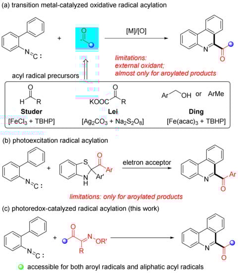 - Liu, J.; Fan, C.; Yin, H.; Qin, C.; Zhang, G.; Zhang, X.; Yi, H.; Lei, A. Synthesis of 6-acyl phenanthridines by oxidative radical decarboxylation–cyclization of α-oxocarboxylates and isocyanides. Chem. Commun. 2014, 50, 2145–2147. [Google Scholar] [CrossRef]