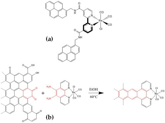 Chemical sketches of the modified fac-Re(bpy)(CO)3Cl for further non-covalent immobilization. (a,b) were adapted with permission from ref. [31,32], respectively.