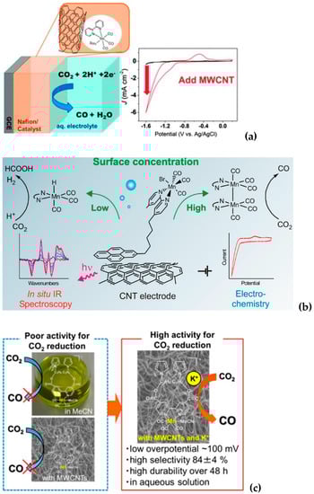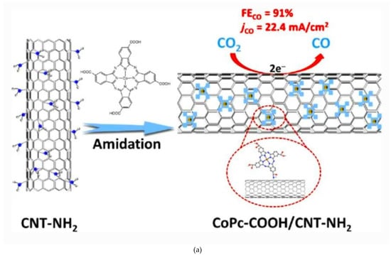 Among the most recent and original results, cobalt phthalocyanines modified with -NH2 groups were dispersed on CNTs and were found to catalyze the electrochemical conversion of carbon dioxide to methanol (Figure 7a) [15,16]. In the same year, a cobalt phthalocyanine bearing a trimethyl ammonium group appended to the phthalocyanine macrocycle adsorbed on MWCNTs was found to be able to catalyze the reduction of CO2 to CO in water with 95% selectivity, good stability, and a maximum partial current density of 165 mA cm−2 (at −0.92 V vs. RHE) [16]. Conversely, a Co porphyrin catalyst was previously adhered on CNT supporting material, which greatly enhanced catalytic activities and enabled catalysis in water, which was otherwise impossible. However, the main reduction product still remained CO [73,74].