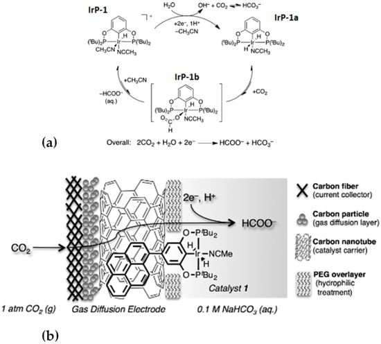 (a) Proposed mechanism for CO2 water-assisted reduction mediated by IrP-1. Reproduced with permission from ref. [42], (b) carbon nanotube-coated gas diffusion electrode with surface-bound Ir pincer dihydride catalyst for electrochemical reduction of CO2 to formate. Reproduced with permission from ref. [47].