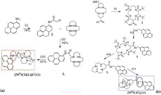 (a) Synthetical steps for a cyclam derivative N-functionalized with a pyrene moiety. Adapted from ref. [57], (b) Synthetical steps for a cyclam derivative C-functionalized with pyrene. Adapted from ref. [59].