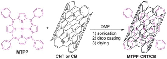 As mentioned earlier, metal phthalocyanines can be easily adsorbed on surfaces because of their scarce solubility in organic solvents and water. Commonly employed techniques for functionalizing these molecules are dip-coating and drop-casting. Dip-coating is a simple and low-cost method that involves the deposition of a wet liquid film by simply immersing the electrode in a solution containing the metal catalysts (i.e., solutions of cobalt phthalocyanine in dimethylformamide). After drying the substrate, a homogeneous liquid film is formed on the substrate’s surface. This technique allows acquisition of very reproducible results in comparison with the drop-casting method. The latter is very commonly employed for producing chemically modified electrodes in which the modifying layer is composed of particles such as nanotubes or nanoparticles. The major drawback of drop-casted surfaces is their scarce reproducibility [60,61]. A very recent and detailed review about immobilization strategies for porphyrin-based molecular catalysts for the electroreduction of CO2 was published in 2022 by Burdyny et al. [62]. In this review, the authors listed the majority of the variously substituted Fe tetraphenyl porphyrin that have been shown to be the most active homogeneous catalysts for CO2-to-CO conversion in aprotic solvents (DMF, MeCN) reported in the literature [2,63,64,65,66,67,68,69,70,71]. Few examples will be cited herein; for a more extensive screening for this category of catalysts, the reader is redirected to ref. [62]. One of the earliest works on heterogenization of porphyrins reported a pyrene-appended iron triphenyl porphyrin bearing six pendant OH groups on the phenyl rings in all ortho and ortho′ positions that was immobilized on carbon nanotubes via non-covalent interactions and that was further deposited on glassy carbon. This modified electrode was found to be active for electroreduction of CO2 to CO in water (pH 7.3) with 480 mV overpotential [72]. A comparative study of amino functionalized iron-tetraphenylporphyrins (amino-Fe-TPPs) immobilized onto carbonaceous materials in both H-cells and flow cells was conducted to selectively reduce CO2 to CO. In a flow cell set up operating in alkaline media, the resulting hybrid catalyst exhibited 87% faradaic efficiency with extraordinary current density (j) of 119 mA/cm2 and turnover frequency of 14 s−1 at −1.0 V vs. RHE. By combining the heterogenization approach with a flow cell design it was possible to obtain a significant catalytic activity and an effective strategy for future approaches toward CO2RRs. Figure 6 depicts an operational scheme for common immobilization of metal tetraphenyl porphyrins on CNTs.