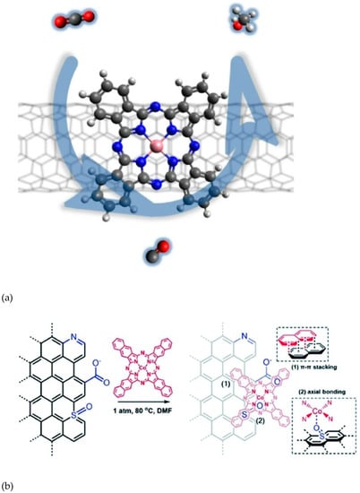 In a relatively recent paper, planar Co(II)-2,3-naphthalocyanine (NapCo) complexes were immobilized onto doped graphene, which resulted in a heterogenous catalytic system for the CO2-to-CO reductive pathway (Figure 7b) [75]. A systematic study revealed the importance of the dopants employed; compared to carboxyl dopants, the sulfoxide dopants further improved the electron communication between NapCo and graphene, which increased the turnover frequency of Co sites by ~3 times for CO production with a faradaic efficiency up to 97%.