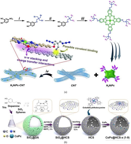 (a) Schematic illustration of the overall synthetic procedure for N3NiPc and N3NiPc–CNT: (i) DMF, K2CO3, r.t., 72 h; (ii) DMF, NaN3, 80 °C; (iii) nickel acetate after dehydration, DBU, 135 °C, 48 h, Ar gas; and (iv) THF, 80 °C, 24 h. Reproduced with permission from ref. [83], (b) Illustration of the preparation procedure of CoPc@HCS-x (x = 1–9) heterogeneous molecular catalysts. Reproduced with permission from ref. [84].
