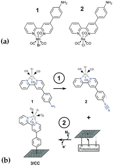 In 2017, we reported the catalytic activities of fac-Mn(apbpy)(CO)3Br and fac-Re(apbpy)(CO)3Cl (where apbpy = 4(4-aminophenyl)-2,2′-bipyridine), Figure 12a, anchored on glassy carbon electrodes [89]. The functionalization was performed via two different immobilization strategies: (a) direct electrochemical oxidation of the amino group with the formation of C-N bonds and (b) electrochemical reduction of the corresponding diazonium salts with the formation of C-C bonds.