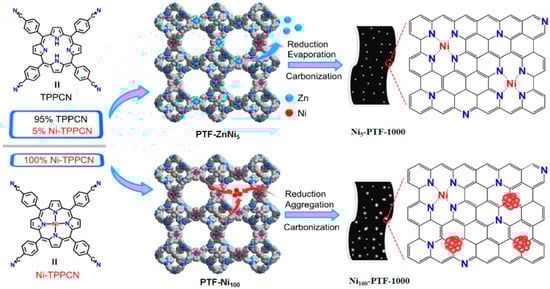 Wu and co-workers [101] were able to obtain porphyrinic triazine frameworks through the polymerization of the monomers 5,10,15,20-tetrakis(4-cyanophenyl)-porphyrin (TPPCN) or [5,10,15,20-tetrakis(4-cyanophenyl)-porphyrinato]-Ni (Ni-TPPCN) with different molar ratios in the presence of ZnCl2 (see Figure 13).