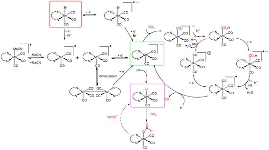 In 2011, Deronzier et al. [34] replaced Re with the cheaper and more abundant fac-Mn(bpy)(CO)3Br. The electrochemical mechanism of Mn(bpy)(CO)3Br has been extensively studied [34,35,36,37,38,39,40]. The proposed mechanism in a homogeneous solution is shown in Scheme 1. From the depicted mechanism, it is clear that Mn requires addition of external proton sources to activate catalysis. Once CO2 binds the metal center of the five coordinate species [Mn(bpy)(CO)3]−, a sequence of protonation and reduction steps occurs. Two possible catalytic pathways focused on the different sequences of the reduction/protonation steps for evolution of the abovementioned metal carboxylic adduct have been proposed. The protonation-first pathway starts with heterolytic C–OH bond cleavage of the [Mn(bpy)(COOH)] species facilitated by a proton donor leading to the formation of H2O and [Mn(bpy)(CO)4]+, which is further reduced to generate [Mn(bpy)(CO)4]●. In contrast, the reduction-first pathway proceeds with reduction of [Mn(bpy)(COOH)] followed by heterolytic C–OH bond cleavage, which yields H2O and the common [Mn(bpy)(CO)4]● intermediate. Stepwise or concerted one-electron reduction and CO evolution steps complete the catalytic cycle, regenerating the active catalyst. Notably, Scheme 1 also indicates the possible formation of the Mn hydride species, which is considered to be the main intermediate for formate release through the formation of the formato complex (MnO(CO)H). New mechanistic insights have been provided by Daasbjerg and co-workers [41]. They found that the dimer complex, Mn2(bpy)2(CO)6, is not, as is often assumed, formed by dimerization of the singly reduced manganese complex, [Mn(bpy)(CO)3]●, but that it is instead produced from its reduction to [Mn(bpy)(CO)3]−. The formation of the dimer by this parent–child reaction can be suppressed by employing bulky ligands or immobilize Mn(bpy)(CO)3Br on surfaces.
