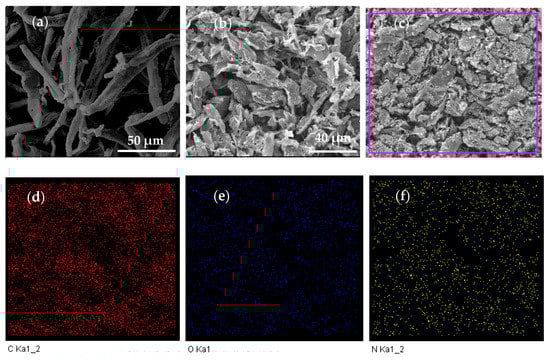 The surface morphology structure difference between pristine poplar powder and N-PPB investigated in terms of SEM with the results shown in Figure 1. It could be observed from Figure 1a that pristine poplar powder displayed a smooth strip shape. After pyrolysis treatment, and nitrogen doping, N-PPB750 exhibited a rougher structure with richer porosity (Figure 1b), which was considerably distinguished from pristine poplar powder. At the same time, the particles of N-PPB750 became smaller compared with that of pristine poplar powder, which was attributed to the decomposition of lignocellulose component in the poplar powder during pyrolysis process [15]. The pyrolysis treatment also promoted the exfoliation of the carbon layers, which lead to the formation of abundant pores. The EDS elemental mapping diagrams shown in Figure 1d–f demonstrated that several main elements including C, N, and O were uniformly distributed N-PPB750. The contents of three major elements shown in Table 1 illustrated that a quite high content of N element (17.98 wt%) imported by urea precursor was anchored in the biochar structures.