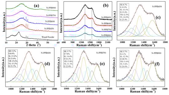 (a) XRD patterns, (b) Raman spectra, and (c–f) deconvoluted Raman spectra of N-PPB450, N-PPB600, N-PPB750, N-PPB900.