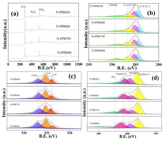 XPS analysis was then conducted to further explore the surface element composition of the prepared N-PPB. As illustrated in Figure 3a, the main elements of C, N, and O were all observed in the spectra of the biochar samples, in which the concentration of N decreased significantly with the increase in the pyrolysis temperature. Figure 3b–d reveals the deconvoluted C1s, O1s, and N1s spectra. It was observed from Figure 3b that C1s spectrum was mainly composed of four peaks located at 284.5 eV, 285.2 eV, 286.2 eV, and 288.8 eV, which represented the C=C/C-C, C–O, C=O and COOH bonding, respectively [23,24]. Similarly, the O1s spectrum could be divided into C=O (530.9 eV), C-O (532.2 eV), and COOH (533.6 eV) (Figure 3c), and N1s spectra could be deconvoluted into four peaks corresponding to pyridinic—N (398.3 eV), pyrrolic—N (399.5 eV), graphite—N (400.4 eV), and −NOx (401.4 eV) (Figure 3d) [25]. The detailed concentrations of respective bonding were listed in Table 2. As shown, the concentration of C=C/C-C decreased with the increment of pyrolysis temperature from 450 °C to 900 °C, which was in agreement with the Raman results. Correspondingly, the proportion of C=O bonding increased with the increase in the pyrolysis temperature, which could be resulted from the conversion of C=C/C-C bonding. As for N1s bonding, the conversion of pyrrolic N or pyridine N to graphitic N could be obviously seen.