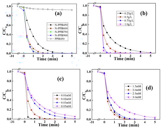 N-PPB600 was selected for the following test. The impact of reaction parameters, including BPA concentration, catalyst dosage, and PMS concentration on the performance of N-PPB600, was then investigated with the results shown in Figure 4b–d. It was revealed that the catalytic performance of N-PPB600 had a positive correlation with the catalyst dosage, and had a negative correlation with the BPA concentration. It was easy to understand that increased catalyst dosage could increase the number of active sites for PMS activation, which led to the increase in active species for BPA degradation [26]. Conversely, when the concentrations of both N-PPB600 and PMS were fixed, a constant number of active species was insufficient to degrade increased amount of BPA molecules, which resulted in the performance decline of N-PPB600. While when the concentration of PMS was increased in the reaction solution, the performance of N-PPB600 increased when PMS concentration increased from 1.5 mM to 2.0 mM, and declined when further increasing the PMS concentration. This might because an excessive amount of PMS would also consume the generated active species, which inhibited the BPA degradation [27].