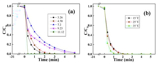 Impact of (a) pH value and (b) solution temperature on the performance of N-PPB600 ([catalyst]0 = 0.5 g/L, [BPA]0 = 0.02 mM, [PMS]0 = 1.5 mM).