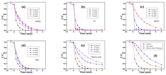 Impact of (a) H2PO4−, (b) Cl−, (c) HCO3−, (d) NO3−, (e) humic acid, and (f) natural water on the performance of N-PPB600 ([catalyst]0 = 0.5 g/L, [BPA]0 = 0.02 mM, [PMS]0 = 1.5 mM).