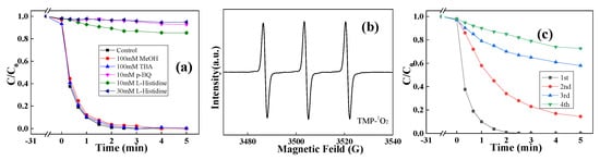 (a) BPA degradation in N-PPB600/PMS system at the existence of various scavengers, (b) ESR spectra test, (c) recyclability test for N-PPB600 ([catalyst]0 = 0.5 g/L, [BPA]0 = 0.02 mM, [PMS]0 = 1.5 mM).