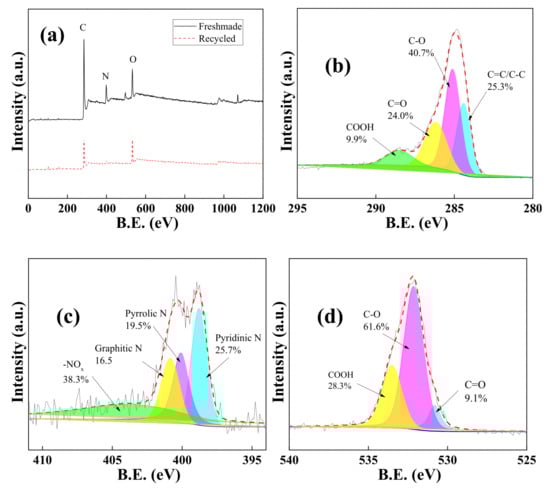 The catalytic stability of N-PPB600 was investigated afterwards. It was seen from Figure 7c that the catalytic capability of the biochar gradually reduced after four consecutive runs, which indicated that the active sites on the catalyst surface was continuously consumed when activating PMS. Thus, the XPS spectra of the recycled N-PPB600 was investigated to illustrate the PMS activation mechanism with the results shown in Figure 8. As shown in Figure 8a, the N element was significantly consumed after consecutive BPA degradation cycles, indicating that N doping played a critical role of improving the catalytic properties of the biochar. From the deconvoluted C1s, N1s, and O1s spectra shown in Figure 8b–d, it was seen that the concentrations of C=O, pyridinic N and graphitic N were reduced after the reaction cycles, implying that these bonding participated the PMS activation and were consumed gradually, which were in accordance with many previous studies [34].