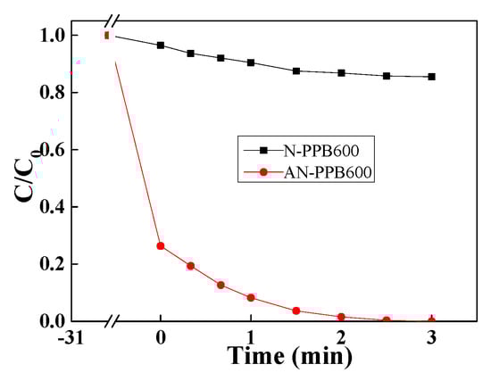 To improve the BPA degradation efficiency of the biochar, AN-PPB600 was prepared to enhance the adsorption capability of the biochar. It was seen that AN-PPB600 had much higher specific surface area and pore volume than N-PPB600 after KOH activation (Table 3), which indicated that AN-PPB600 should have better adsorption capability than N-PPB600. As illustrated in Figure 9, ~80% of BPA could be adsorbed by AN-PPB600 at the first 30 min, while no more than 10% of BPA was adsorbed by N-PP600. When PMS was dosed, 0.5 g/L of AN-PPB600 could completely remove BPA with high concentration of 0.1 mM through adsorptive/catalytic synergy within 3 min. Conversely, N-PPB600 could only degrade ~15% of BPA within the same time span. This indicated that through designing hieratical structured biochar with both high adsorptive and catalytic capability, organic pollutants in water could be promptly removed through the synergetic process.