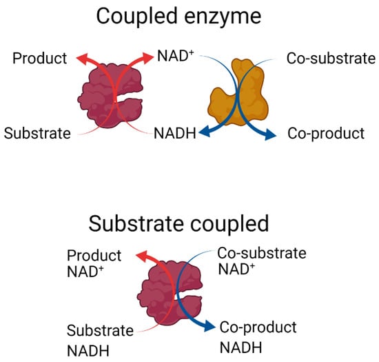 Enzymatic recycling of nicotinamide cofactors in batch reactors. Top: The coupled enzyme approach to cofactor recycling. An NADH-dependent enzyme (maroon) converts a substrate to the desired product. A second enzyme (mustard) is included to convert a co-substrate to a co-product while regenerating the nicotinamide cofactor. Bottom: The substrate-coupled recycling approach uses a single enzyme (maroon) that both converts the substrate to the desired product at the expense of NADH and then recycles the nicotinamide cofactor via a second reaction, in which a sacrificial co-substrate is converted to a co-product [17]. Created with https://biorender.com (accessed on 4 November 2022).
