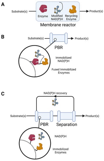 Successful approaches to supplying NAD(P)H to biocatalytic continuous-flow reactors. (A) Increasing the mass of NAD(P)+/NAD(P)H to enable its retention in membrane reactors; (B) tethering of both enzymes and cofactors to allow for the use, retention, and recycling of NAD(P)+/NAD(P)H in a packed bed reactor (PBR); (C) tether enzymes for the use and recycling of the cofactor, with the in-line separation and recovery of the cofactor for reuse. The enzymes (maroon and mustard) and cofactor (blue) are shown, the direction of flow is indicated by the black arrows, magnified sections showing the molecular arrangement of the enzymes and cofactors are shown in black circles, and the dashed lines represent the solid surfaces of the reactors. This figure was produced using https://biorender.com (Accessed 4 November 2022).